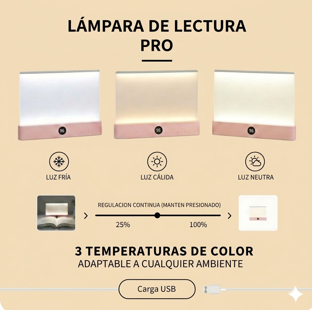 Gracias a sus 3 temperaturas de luz ajustables, la iluminación se adapta a cada momento, reduciendo el cansancio ocular incluso durante largas sesiones de lectura.